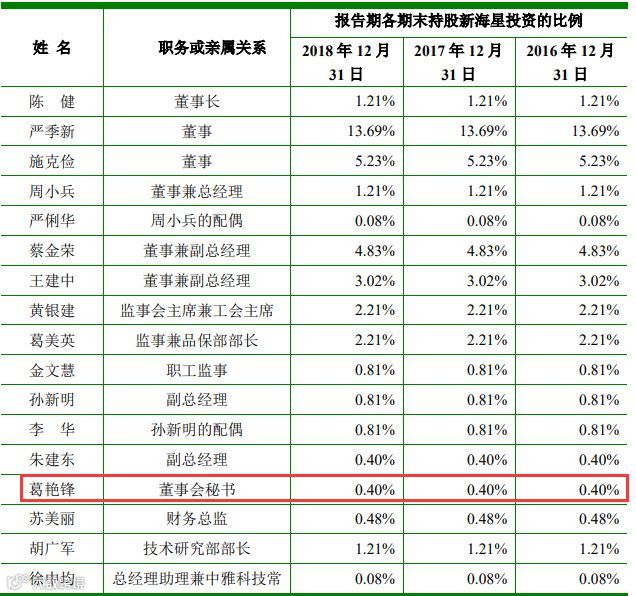 招股书资料显示,公司董秘葛艳锋先生,1978 年出生,中国国籍,无永久境外居留权,本科学历,中级经济师。2005 年 1 月至 2008 年 7 月,担任海星有限办公室副主任;2008年 8 月至 2011 年 12 月,担任海星有限办公室主任;2012 年 1 月至 2013 年 5 月,担任海星有限总经理助理;2013 年 6 月至今,担任海星股份董事会秘书。