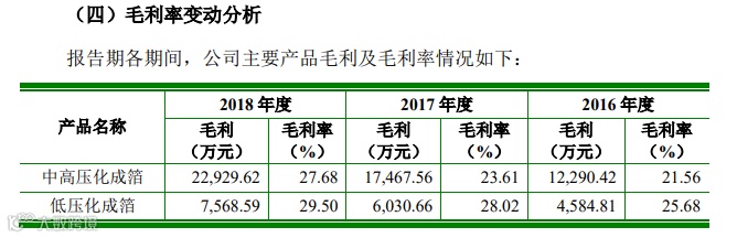 从业绩来看,公司2016年至2018年的营收分别为7.56亿元、9.6亿元、10.92亿元。扣非净利分别为5340.27万元、8186.02万元、1.37亿元。公司主营产品中高压化成箔和低压化成箔的毛利率分别为27.68%和29.5%。