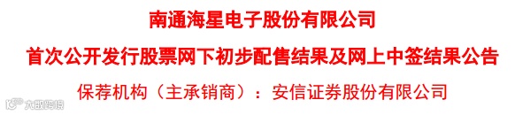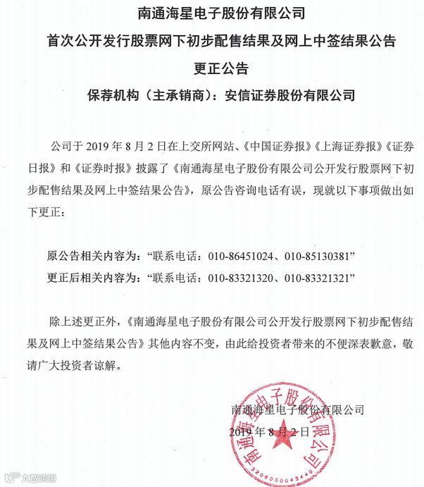 8月2日午间,海星股份(603115.SH)发布《南通海星电子股份有限公司首次公开发行股票网下初步配售结果及网上中签结果公告 更正公告》,对此前发布的中签结果公告的保荐机构(主承销商)联系方式进行更正。