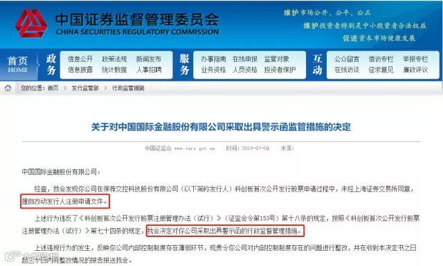 7月4日,证监会官网发布两条行政处罚决定,分别给了中金公司和交控科技,理由是中金公司在保荐交控科技科创板IPO申请过程中,未经同意,擅自改动注册申请文件。