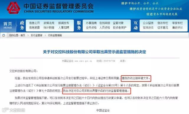 罚单同时还开给交控科技,原因也是擅自改动注册申请文件。