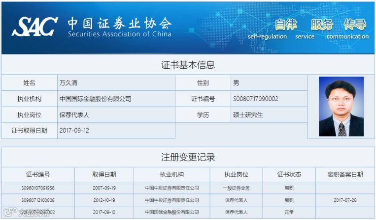 万久清则此前长期在中投证券执业,2007年取得一般证券业务执业资格,2012年获得保代资格。2016年11月,中金公司传出收购中投证券消息,投行部门成为最早发生人员变动的部门之一。2017年9月,万久清执业公司变更为中金公司。