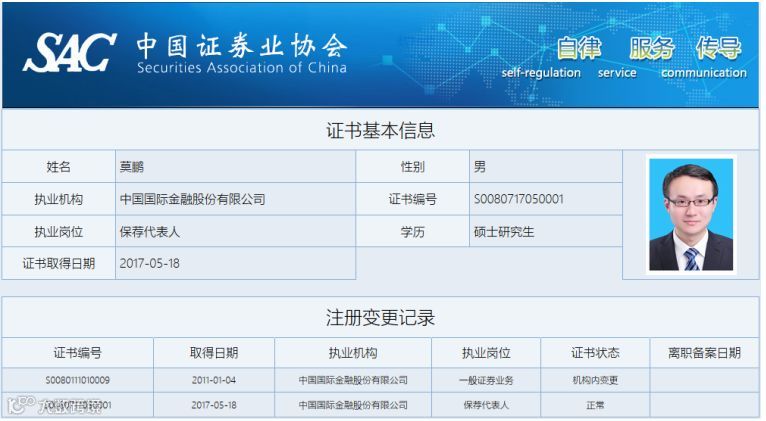 从两位保代的履历来看,莫鹏加入中金公司较早。2011年1月4日,莫鹏首次取得“一般证券业务”资格,彼时即在中金公司执业。2017年5月,莫鹏取得保荐代保人资格。