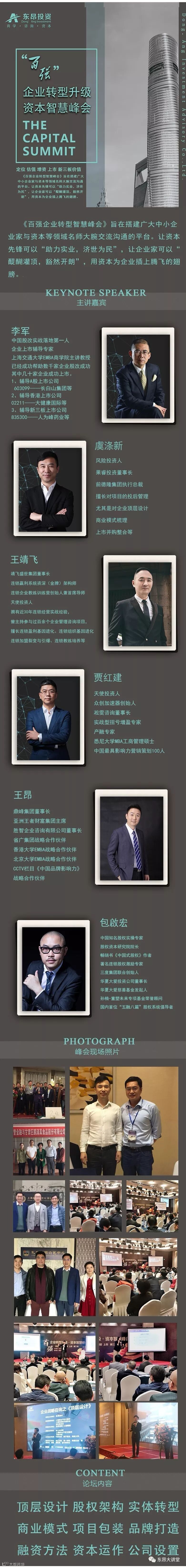 ●为了帮助更多企业家朋友在经营企业过程中少走弯路,传授企业新思维与新方法,让企业永远前行!公司已推出《百强企业转型升级资本智慧峰会》来帮助企业家在企业遇到的难题