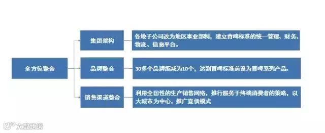 在完成了大规模兼并之后,青啤集团在并购过程中实行了以下三大版块的深度整合,最终成为中国啤酒业的巨头。