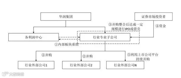 华润对于在自身资源支持下的能够达到行业领先地位的产业,以并购和内部重组的模式快速形成一个产业集团,通过香港的资本市场将它进行IPO或借壳,并进行募资。利用这个产业和资本的平台,吸引国际资本,为产业集团的进一步并购整合提供源源不断的资金。