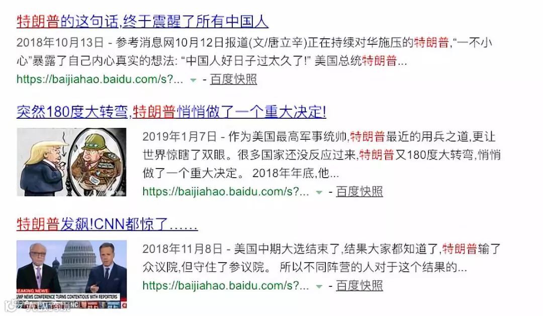如果我们搜索重要的人物呢?比如特朗普。你会发现,第1页的结果分别是:百度百科、百度贴吧、百家号、百家号、百家号、百家号、新浪、百家号、百度百科。