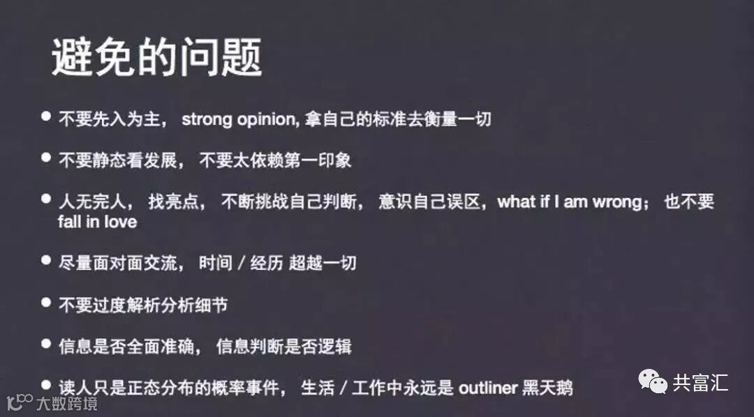 其实对于比较年轻的投资人来说,应该先把重心放在对事情的了解上,别先看人。因为看人是一个很主观的、需要长时间培养的能力。只有你见了足够多优秀的人,你才能把自己对人才的标准建立起来。所以,先从能抓得住的事来入手,看人永远是一个积累的过程。