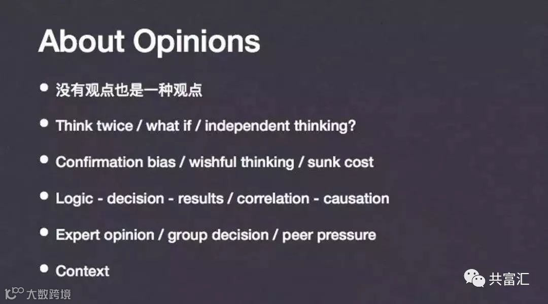 不要怕没有观点,没观点也是一种观点。很多好的投资者就是这样,有时候不要特别着急给出观点,相反在特别重要的时候,你应该让自己放空。尤其对于VC来说,不一定什么事都要有一个观点。