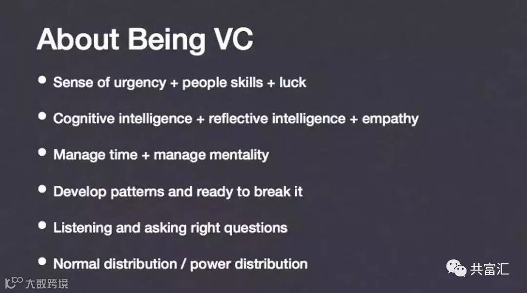另外,VC 需要 people skill 。因为你在找项目的过程中需要和别人建立信任。VC 在别的技能上可以弱,但是 people skill 必须 OK 。