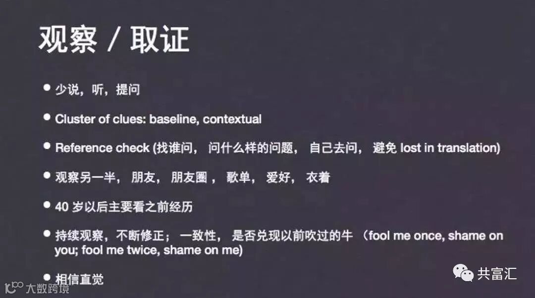 对话过程中让对方处于放松的状态,而不是紧张状态,因为你要让对方说实话;压力测试是看在压力下有什么样的表现;关键一两个问题要问透,这样会对人有比较深的理解;提诱导性的问题,比如说:你觉得我们投了以后,对你有什么帮助,为什么选我们?