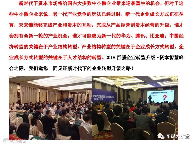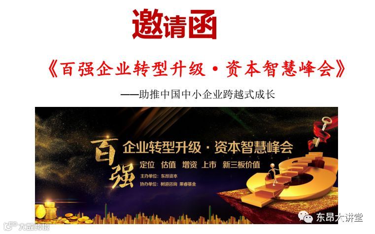 企业家的格局、眼界,决定了企业的发展境界;企业家的学习能力,关系着企业的发展速度与生死存亡。如果企业家不懂资本的知识、不懂公司的顶层设计、没有融资的技巧、没有金融的圈子,没有众筹能力、没有股权划分的思维,企业要想长久发展,赢得现代的竞争分外艰难! 为帮助各位企业家保持与时俱进的学习精神,传授企业新思维与新方法,让企业家永远前行在路上!现诚邀请您参加:《百强企业转型升级.资本智慧峰会》
