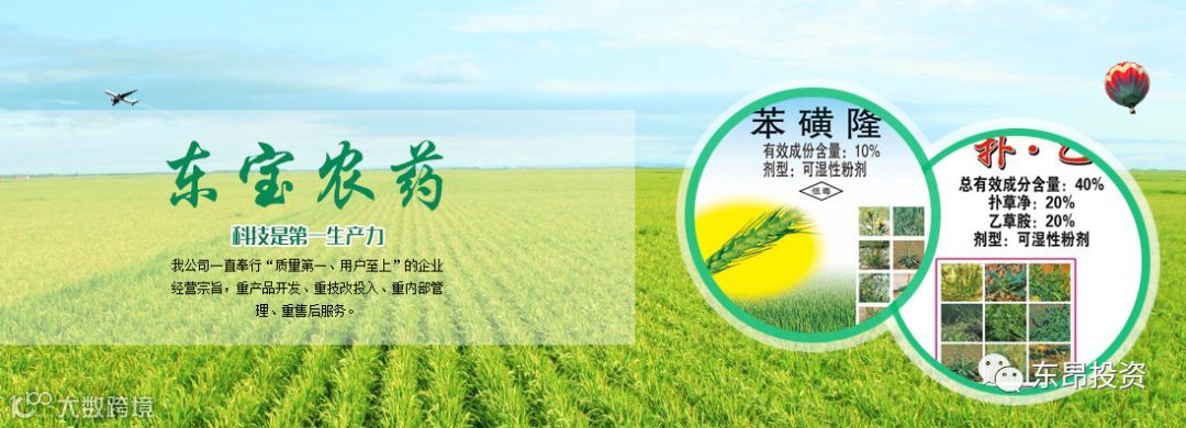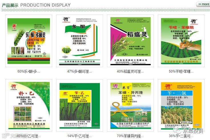 江苏东宝农化股份有限公司(原江苏东宝农药化工有限公司)创建于一九八八年,是国家中型企业、国家高新技术企业、江苏省农业科技型企业、江苏省星火龙头企业、江苏省民营科技企业、江苏省“重合同、守信用”企业、“AAA”级信用企业。公司占地面积50000平方米,年农药生产能力达10000余吨。目前,公司产品结构已形成农药原药和农药制剂两大系列一百多个产品。产品销往全国三十个省、市、自治区。拥有自营进出口权。“东宝”商标为江苏省著名商标。有五个产品被列为江苏省名牌产品。公司及各子公司从事农药的加工、销售经营业务及物流运输业务