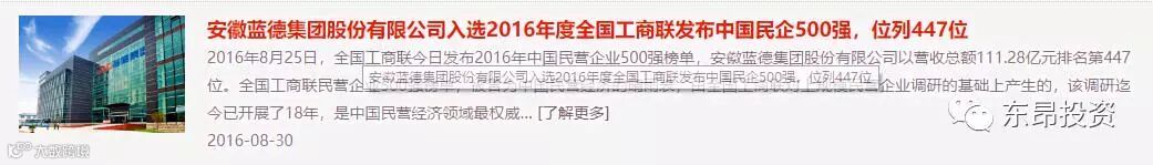 2016年8月25日,全国工商联发布2016年中国民营企业500强榜单,安徽蓝德集团股份有限公司以营收总额111.28亿元排名第447位。
