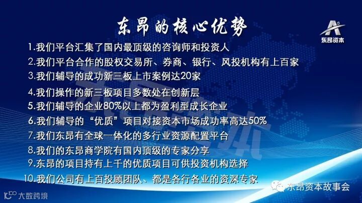 东昂资本拥有辅导企业融资及直通IPO的完善培育体系。目前已帮助几十家企业登陆国内外资本市场。东昂专家团队拥有20余年的资本运作经验。东昂资本生态圈拥有大批拟上市企业、国内外知名投资机构、上市公司联盟、国内外知名券商、律所、会计师事务所以及人才资源,这里将产生未来的千亿级上市公司、百倍的投资回报。