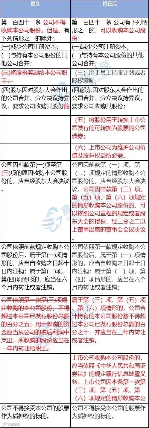 公司法修改是非常重大的事情。此次修法,对公司回购方面有新的改变,修改后的《公司法》明确,六种情形下,公司可收购本公司股份,包括:
