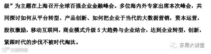 《企业转型-智慧峰会》旨在搭建广大中小企业家与资本等领域名师大腕交流沟通的平台。让资本先锋可以“助力实业,济世为民”,让企业家可以“醍醐灌顶,豁然开朗”,用资本为企业插上腾飞的翅膀