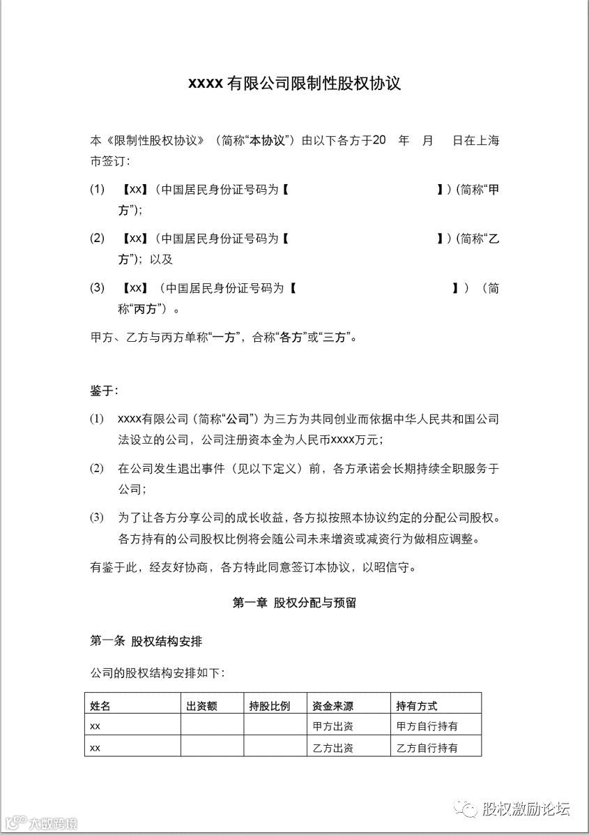导读:来源:股权激励论坛整理,转载请注明合伙人/股东限制性股权协议书