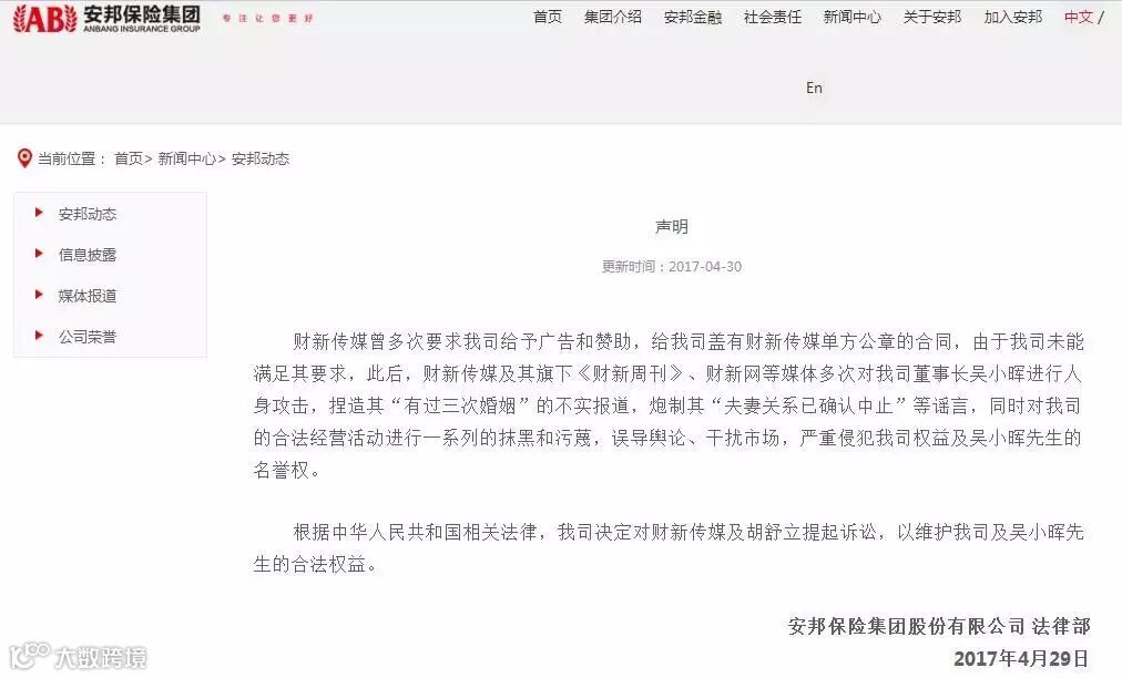 2017年4月30日安邦保险发布声明: