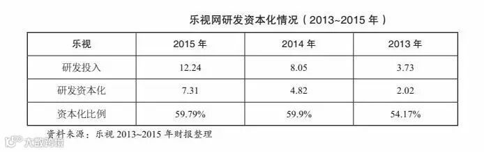 一般来说,一项研发活动只有到开发阶段后期,才能符合资本化条件。到符合资本化条件时,研发活动基本接近尾声,后续的支出很少。所以,企业研发资本化的比例一般都很小,很多高科技企业就直接将研发投入全部确认为研发费用,不进行资本化。但是乐视网的研发资本化比例极高,近三年都超过50%,2014年和2015年接近60%。