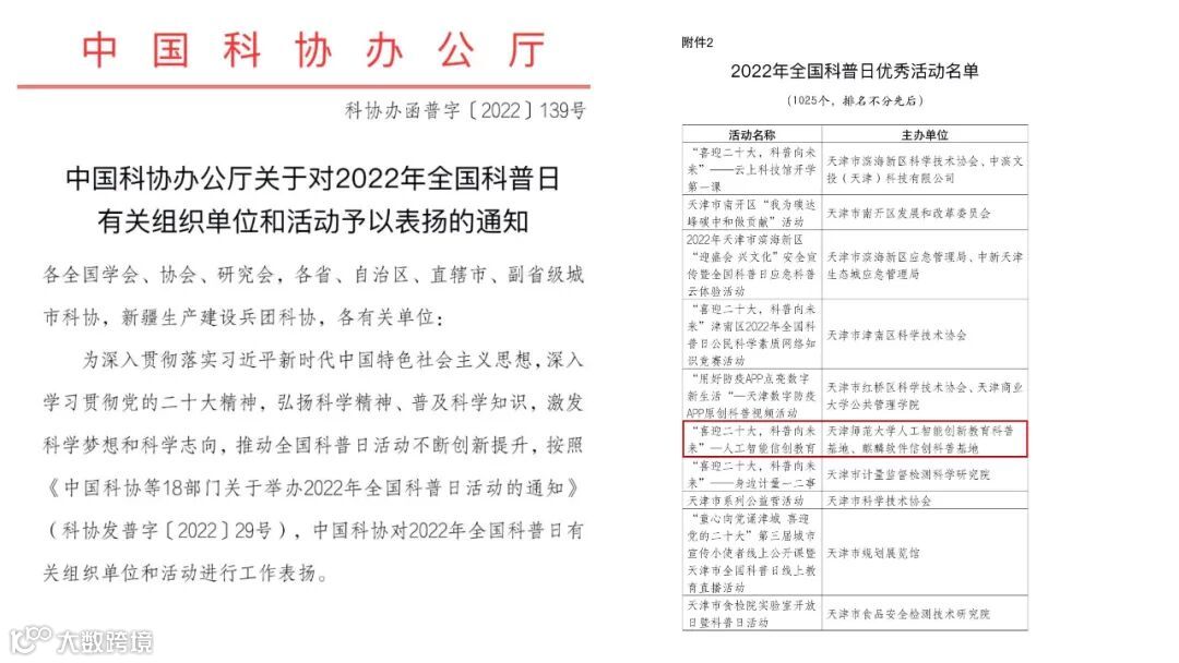 中国科协日前对2022年全国科普日有关组织单位和活动进行工作表扬,麒麟软件信创科普基地和天津师范大学人工智能创新教育科普基地共同主办的“喜迎二十大,科普向未来”人工智能信创教育主题活动成功入选全国科普日优秀活动。