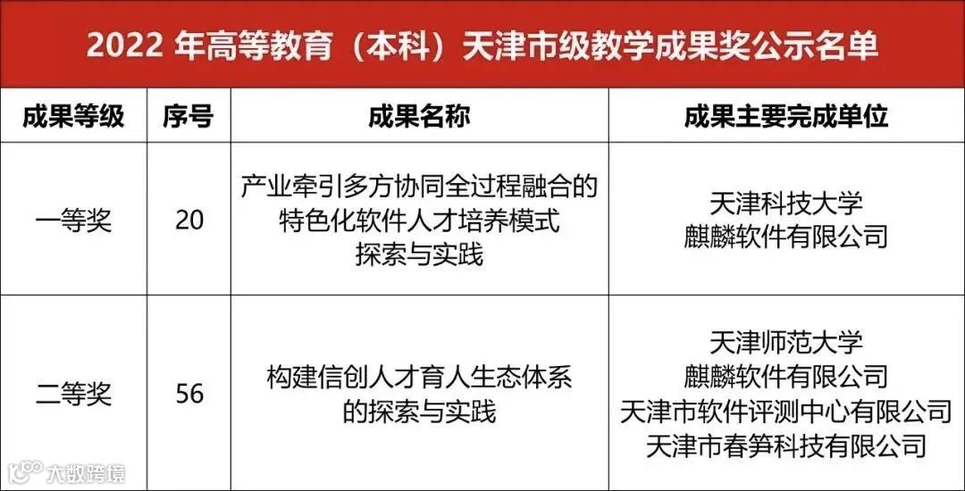 天津市教育委员会发布了《2022 年高等教育(本科) 天津市级教学成果奖公示名单》,麒麟软件与天津科技大学联合申报的《产业牵引多方协同全过程融合的特色化软件人才培养模式探索与实践》项目荣获教学成果一等奖;与天津师范大学联合申报的《构建信创人才育人生态体系的探索与实践》项目荣获教学成果二等奖。
