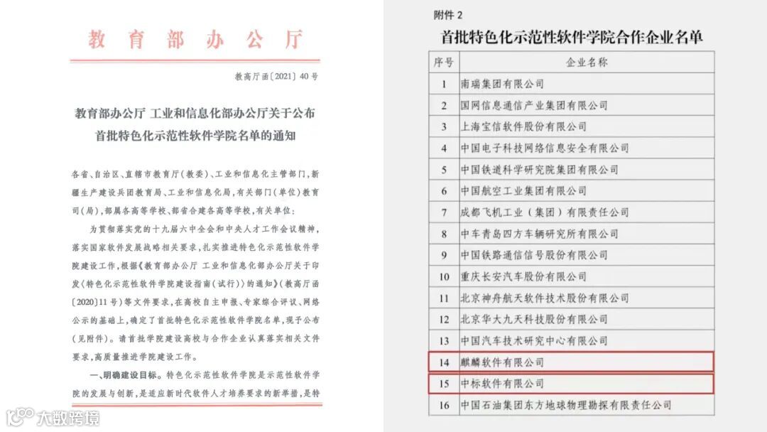 麒麟软件与下属全资子公司中标软件均入选合作企业,教育部办公厅、工业和信息化部办公厅公布的首批特色化示范性软件学院名单,作为合作单位与清华大学、国防科技大学、天津大学、北京航空航天大学四所高校,开展国家特色化示范性软件学院共建。