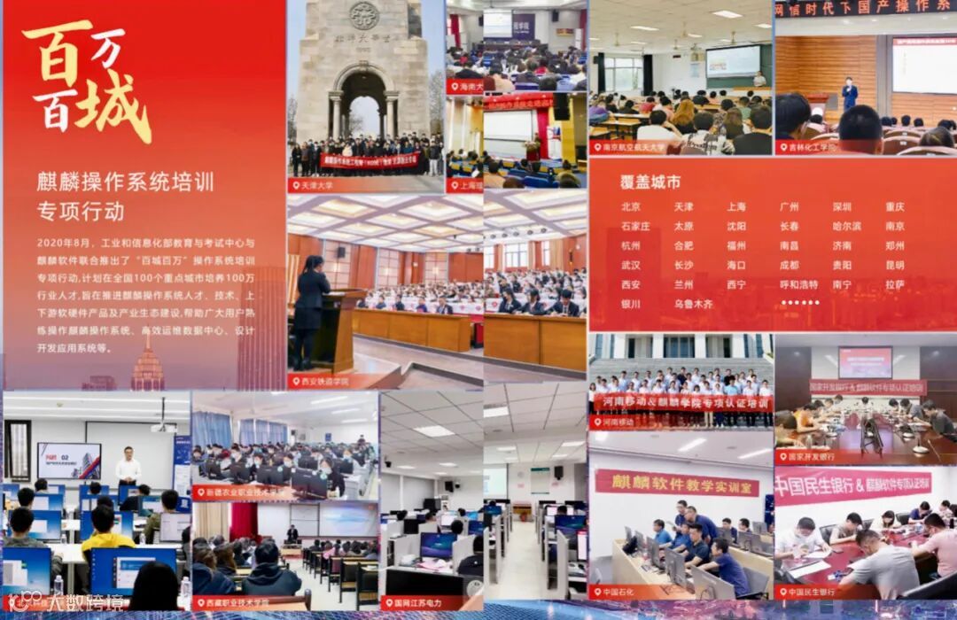 “百城百万”操作系统培训专项行动深入近200个城市、举办培训200多场,新增合作高校69所,麒麟操作系统认证培训触达量突破100万级。