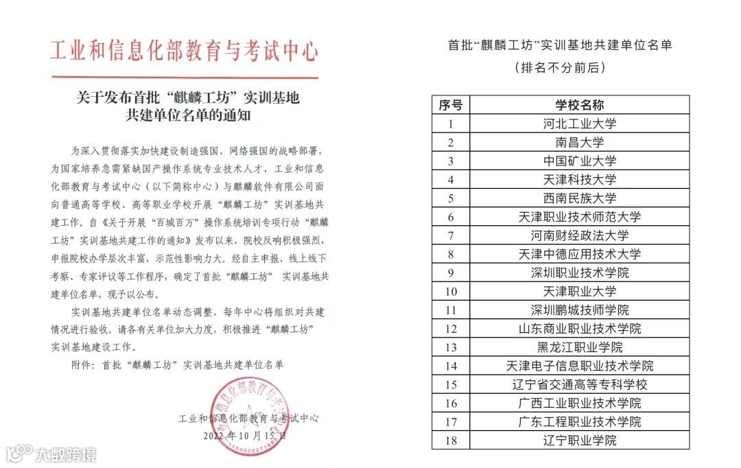 首批麒麟工坊实训基地共建单位名单公布,18所高校入选: