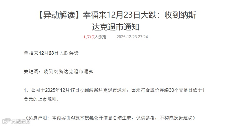 幸福来的退市危机并非突如其来。早在2025年7月11日,公司就因股价连续30个营业日低于1美元而收到了纳斯达克的警示函。