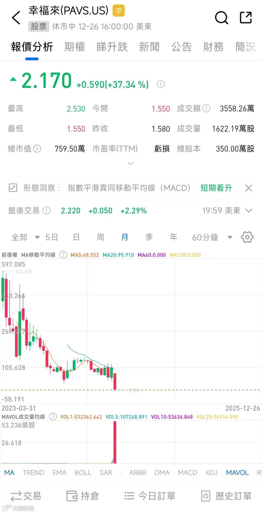 在2025年12月25日,PAVS股价出现了戏剧性反弹,单日飙升23.42%至1.95美元。这场资本市场的“幸福”故事,或许还未到终章。
