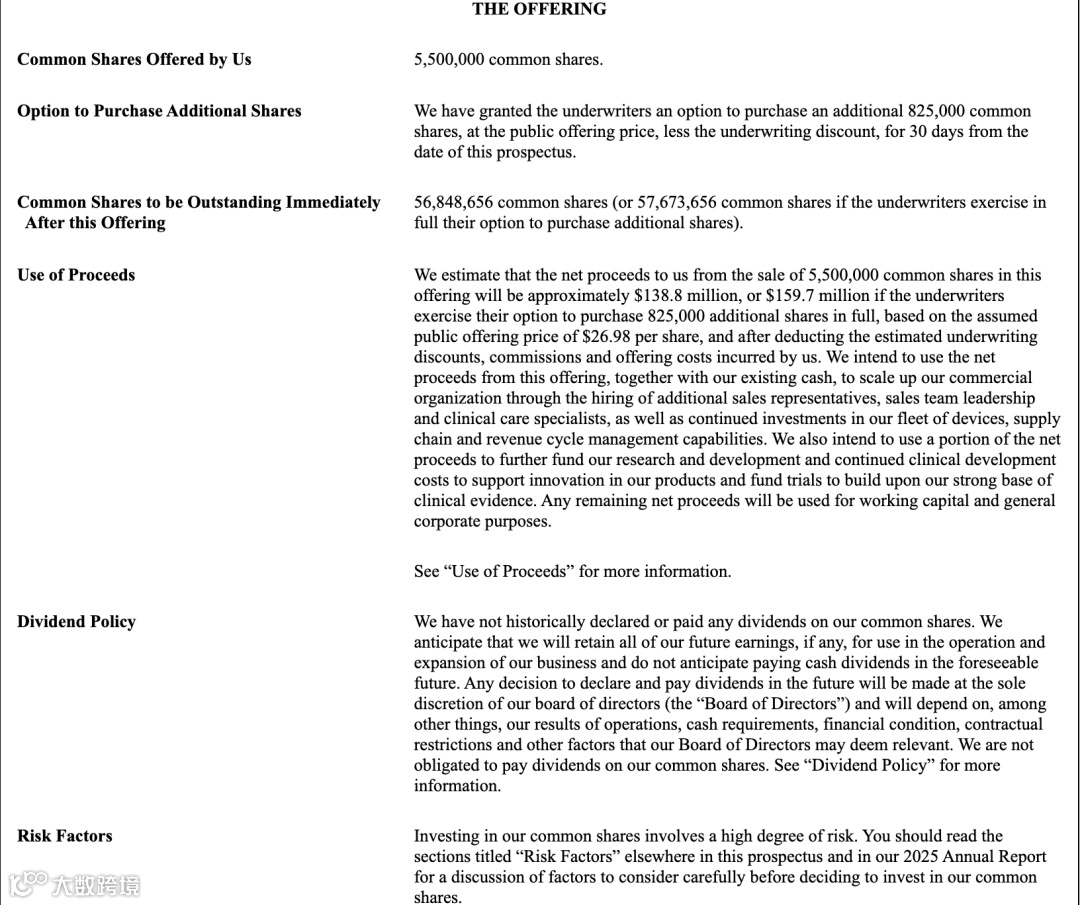 Kestra Medical Technologies, Ltd.(股票代码:KMTS)本次公开募股拟发行 550 万股普通股,并授予承销商额外82.5万股的超额配售选择权。按照每股 26.98 美元的假设发行价(为2025年11月28日公司在纳斯达克的最新收盘价)计算,本次募资规模预计约 1.39 亿至 1.60 亿美元。在扣除承销费用、佣金及相关发行开支后,Kestra 预计可获得约1.388亿至 1.597亿美元净募资,最终金额将根据实际发行情况确定。