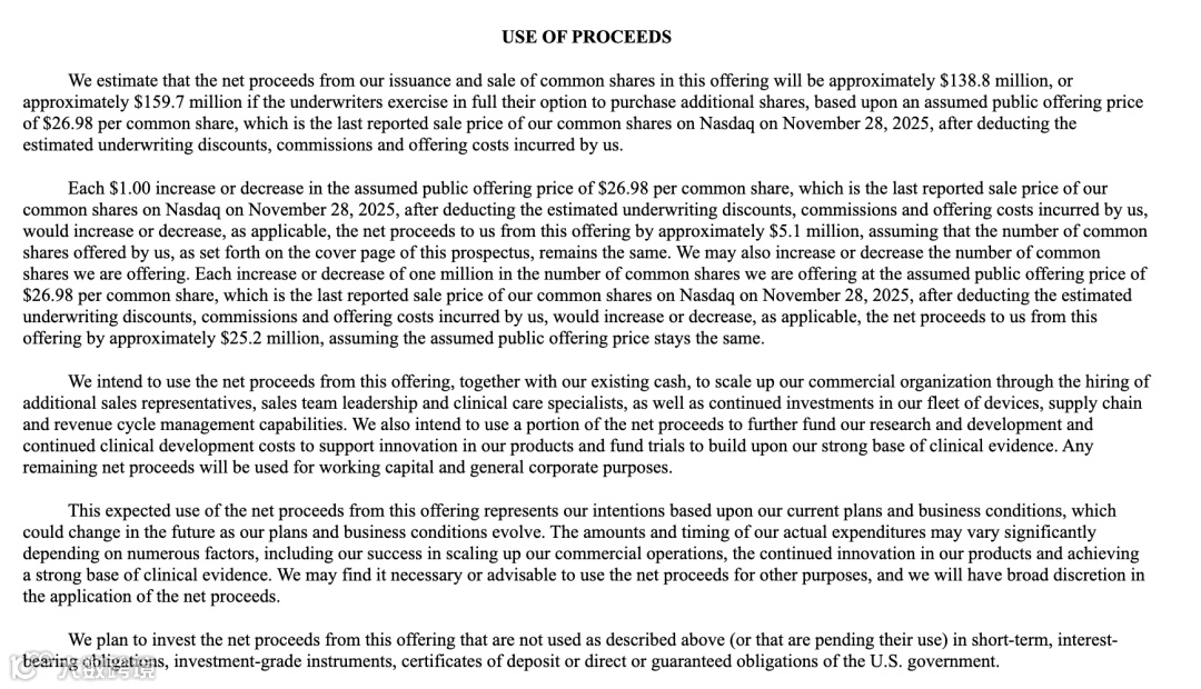 公司表示,本次募资所得将主要用于推进商业化扩张,包括进一步扩大其在美国的销售团队规模、提升销售管理能力、加强临床护理支持人员配置等,以更快覆盖医院、心脏科及电生理科等核心终端市场。同时,Kestra计划投入资金持续扩充其设备租赁池、强化供应链能力及收入周期管理系统,以支撑快速增长的患者需求。部分募资将用于持续开展产品研发与临床研究,支持ASSURE WCD及数字心脏监测平台的迭代创新,并巩固公司在真实世界证据(RWE)方面的领先优势。此外,公司预计将保留部分资金用于日常营运及一般公司用途,包括潜在的市场扩张或业务部署调整,以应对医疗监管变化与行业不确定性风险。