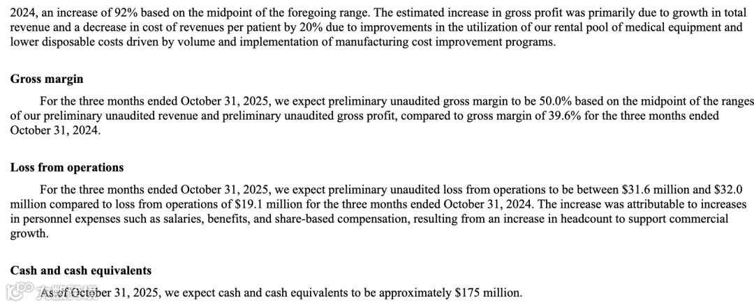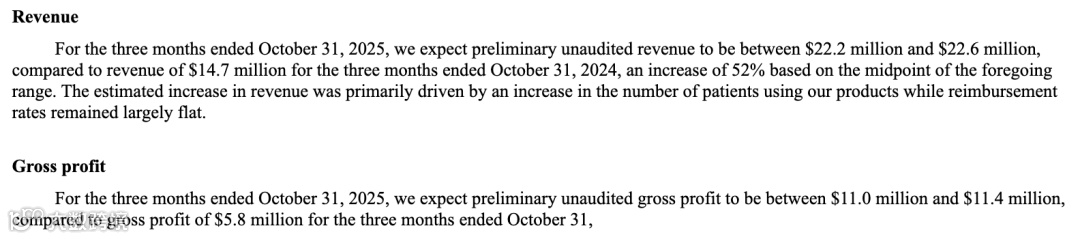 Kestra Medical 在过去一年中展现出强劲的经营增长势头。根据公司向 SEC 提交的最新预估数据,截至2025年10月31日的三个月内,公司预计营收为2220万至2260万美元,相比2024年同期的1471万美元增长约52%。增长主要来自使用公司ASSURE WCD的患者数量持续上升,而报销价格保持稳定,为主营业务带来稳健放量。