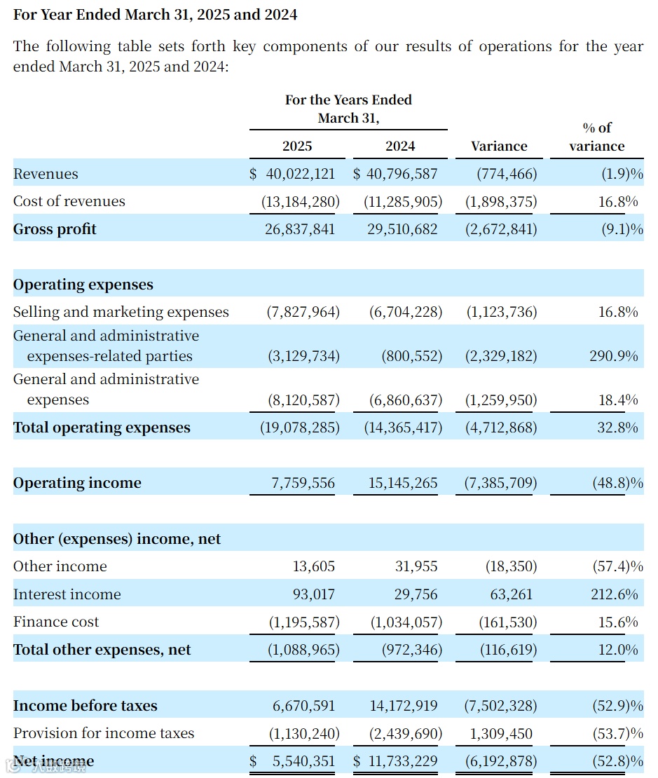 截至2025年3月31日,ANEW HEALTH在营收微降背景下展现出业务结构的深层调整。全年总收入为4002.21万美元,较2024财年的4079.66万美元小幅下降1.9%,但成本控制压力显著:收入成本同比上升16.8%至1318.43万美元,导致毛利润下滑9.1%至2683.78万美元,毛利率从72.3%收缩至67.1%。运营费用成为利润主要拖累项:总运营费用激增32.8%至1907.83万美元。其中,关联方一般行政费用暴涨290.9%(主要源于集团内部服务定价调整),一般行政费用与营销费用分别增长18.4%和16.8%,反映公司扩张期的投入加大。运营利润因此锐减48.8%至775.96万美元。