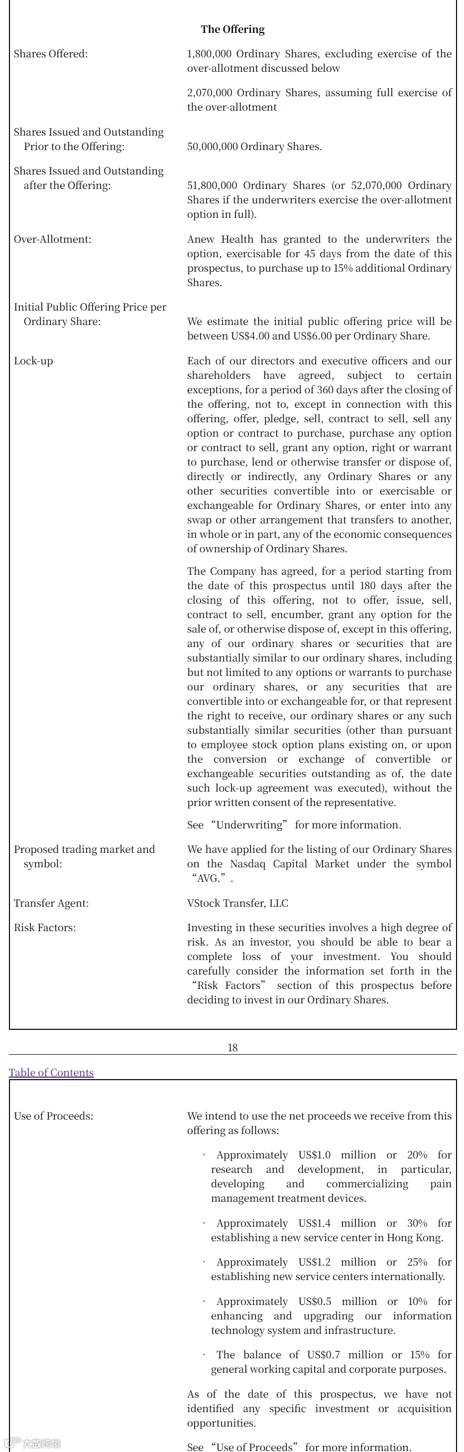 本次发行计划以每股4-6美元的价格区间公开发行180万股普通股,若承销商在45天内全额行使超额配售权(额外认购27万股),发行总规模将扩大至207万股。发行前公司已发行普通股为5000万股,发行后总股本将增至5180万股(全额超额配售达5207万股)。公司计划将募集资金用于五大方向:20%投入疼痛管理治疗设备的研发与商业化,30%用于在香港设立新服务中心,25%拓展国际服务中心,10%升级信息技术系统,剩余15%补充营运资金。本次发行设360天锁定期,公司董事、高管及主要股东同意在此期间不减持股份,同时公司自发行日起180天内不得新增发行类似普通股的证券。公司已申请在纳斯达克资本市场上市,股票代码“AVG”,由VStock Transfer, LLC担任过户代理。
