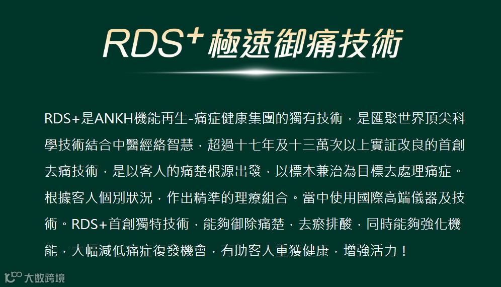 ANEW HEALTH LIMITED(安纽健康有限公司)2007 年创立于香港,16 年来以“ANKH=健康新钥匙”为核心理念,专注非手术、非药物疼痛管理。独家“RDS 修复-排毒-强化”体系,把中医经络学与现代激光、生物电流、电磁、射频、超声波等能量科技整合成标准化方案,可快速止痛、改善关节活动度、提升运动表现与整体活力。香港 3 家旗舰中心、40 万客户数据库、逾 50 人注册中医及治疗师团队,疗程涵盖颈肩腰背、膝踝足弓、运动创伤、术后康复、女性宫寒、亚健康调理等 30 多个适应症,客户满意度 96%以上。零售版图同步扩张:自有功效护肤“ANKH Skin Power”、冷热双效“30s Ice & Warm Rescue”、关节专研“40+ Knee Expert”、17 株活性“Super 17 Probiotics”等 60 余款非处方产品已进驻 200 多家药房、连锁美妆及电商平台,形成“诊-疗-养-护”闭环。公司先后获香港生产力促进局“最佳创新服务奖”、香港品牌发展局“香港新星服务品牌”,并与中国内地、新加坡、马来西亚 10 余家康复机构达成技术输出合作,正筹备深圳前海与广州南沙的第四、第五中心,持续以效果驱动、数据验证、客户口碑领跑大湾区疼痛康复与功能优化市场。