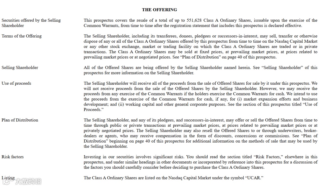 2025 年 08 月 19 日,优品车集团(U Power Limited,纳斯达克代码:UCAR)向美国证券交易委员会(SEC)提交了最新 Form F-1 文件,本次申请涉及 551,628 股 A 类普通股的转售注册,这些股份来自 2025 年 7 月私募配售中发行的认股权证行权。需要特别说明的是,本次 F-1 并非首次公开发行(IPO),也不是公司主动的再融资操作,而是既有股东所持股份的转售注册,公司自身不会因此获得资金,仅承担注册与披露义务。这种安排一方面增强了股东的流动性,同时也提升了公司在资本市场的透明度和合规性。