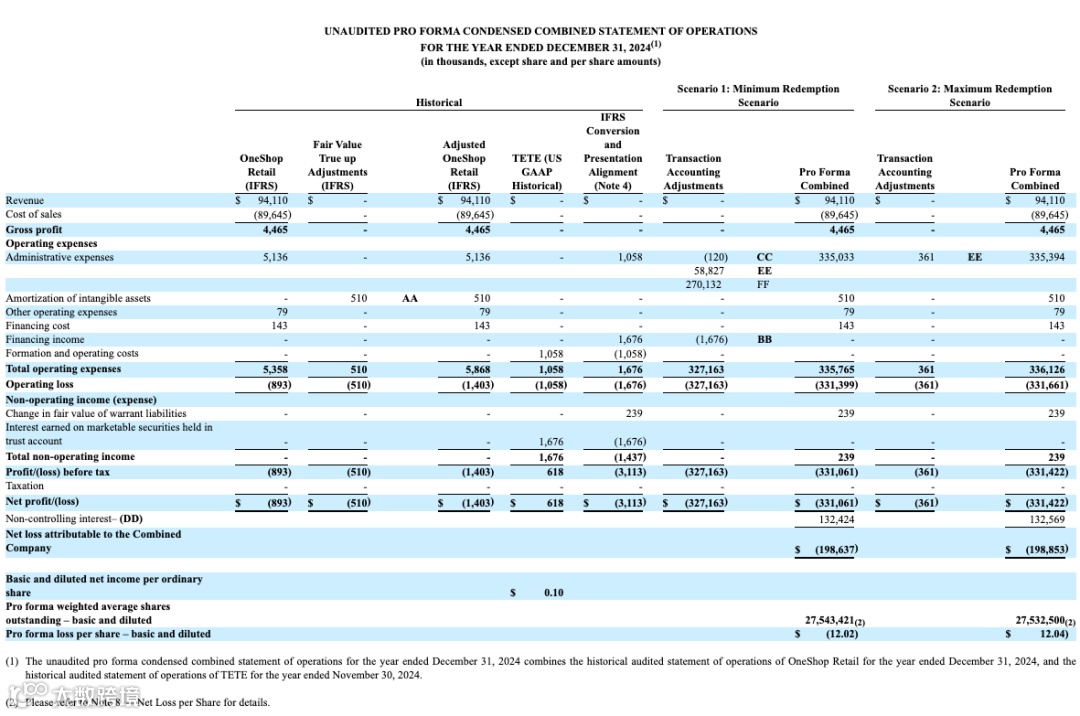 本次交易依据IFRS 2按“资本重组”处理,Super Apps为会计并购方,TETE为被并购方。TETE的净资产按历史成本计量,超出部分作为上市壳资源成本计入费用。财务报表以 2025 年 6 月 30 日为基准,假设交易自 2025 年 1 月 1 日生效,主要经营主体为 OneShop Retail。