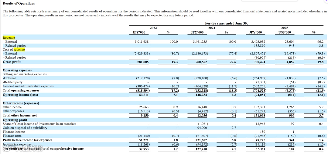 在公司治理层面,IPO 流程规范透明,核心合作机构专业度高:承销商由专业机构担任,美国法律顾问为 Ortoli Rosenstadt LLP,审计服务由 WWC, P.C. 负责(其出具的审计报告为财务数据提供可靠支撑);同时全面披露股权结构、募资计划与用途,如执行董事 Rakuyo Otsuki 合计控制约 70.48% 投票权的股权情况,以及 IPO 募资的具体用途,合规基础扎实。