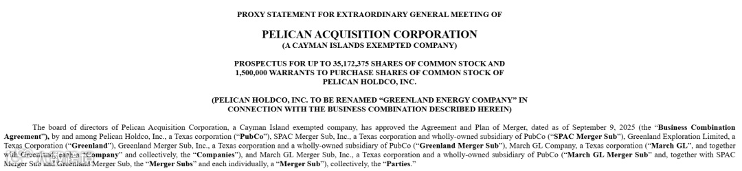 此次证券发行披露,完整呈现了SPAC生命周期中“去SPAC化”(De-SPAC)环节的全部合规细节与资本市场沟通要点:开曼豁免公司Pelican Acquisition Corporation作为上市空壳,在董事会及股东授权链条下,先与德克萨斯州注册、即将更名为Greenland Energy Company的Pelican Holdco, Inc.签署《合并协议》,再向下串联SPAC Merger Sub、Greenland Exploration Limited及其境内外子公司等多级并购主体,通过“现金+股权+权证”三步走架构,把原本处于私募阶段、专注油气上游资源开发的Greenland系资产整体注入上市公司,实现控制权转移与业务接续;为完成交易,公司同步向SEC递交经S-4表整合的代理声明(Proxy Statement)与招股书(Prospectus),一次性履行1933年《证券法》注册、1934年《证券交易法》信息披露及股东表决召集义务,注册上限35,172,375股普通股与1,500,000份上市认股权证,既用于支付对价、也为后续资本重组和流动性提供“弹药”。