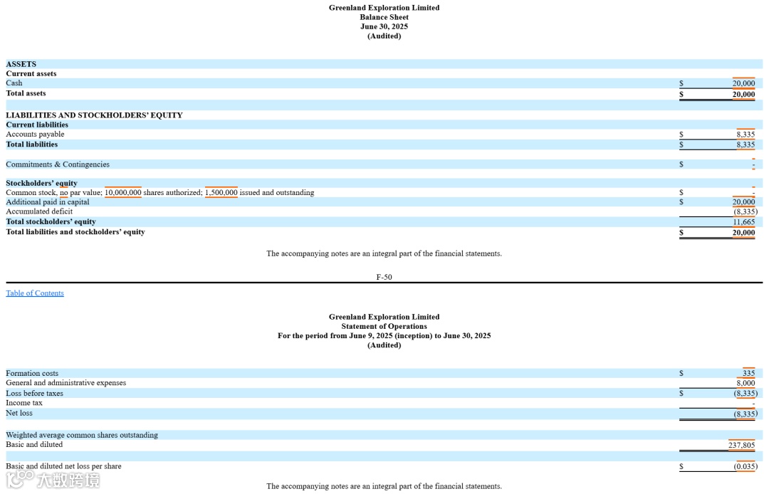 根据截至2025年6月30日的经审计财务报表,主体Greenland Exploration Limited(以下简称“公司”)在成立初期(2025年6月9日至6月30日)展现出初创企业的典型财务特征。资产负债表显示,公司总资产为20,000美元,全部以现金形式持有,资本结构清晰。负债总额为8,335美元,主要为应付账款,反映公司运营初期的业务启动成本。股东权益为11,665美元,其中股本为零面值,额外实收资本20,000美元,累计亏损8,335美元,表明公司已通过股权融资获得启动资金,但运营初期即产生亏损。