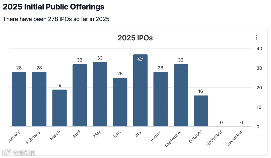 步入2025年,全球IPO市场一扫过去两年的低迷,迎来了久违的高光时刻。根据StockAnalysis数据,截至10月初,美国市场已完成278起IPO,较2024年同期增长超过70%,已经超过了2024年的整年IPO数量,显示出投资者风险偏好显著回升。纳斯达克官方的IPO Pulse(脉搏指数)也已连续五个月上行,并在9月创下八个月新高,表明新股发行活动正在全面复苏。