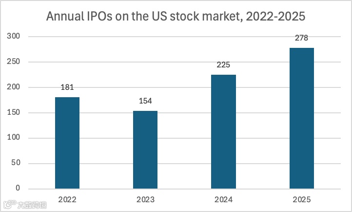 根据Nasdaq官方统计,2025年共有175家运营公司完成上市,首日表现亮眼。以市值加权法计算,这些运营公司首日平均上涨约34%,是2023年与2024年平均水平的两倍,也是自2014年以来的次高纪录。在这175家公司中,有72家首日涨幅超过10%,18家上涨至少50%,更有8家公司股价暴涨逾125%,充分反映出市场热度与投资者追逐新股的热情。