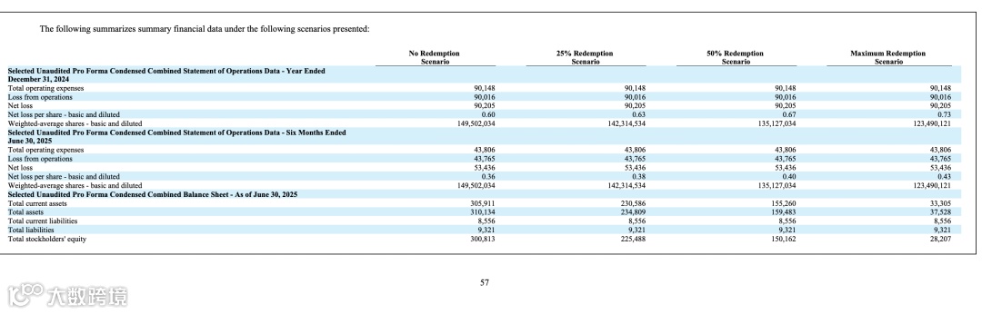利润端数据更具一致性:2024 年全年,总运营费用 90148 万美元,经营亏损 90016 万美元,净亏损 90205 万美元;2025 年上半年,总运营费用 43806 万美元,经营亏损 43765 万美元,净亏损 53436 万美元,这两组核心盈利指标在四种情景下完全相同。唯一差异体现在每股净亏损(基本及稀释),2024 年从 0.60 美元(无赎回)升至 0.73 美元(最大赎回),2025 年上半年从 0.36 美元升至 0.43 美元,主要因加权平均股数随赎回减少,从 149502034 股降至 123490121 股。