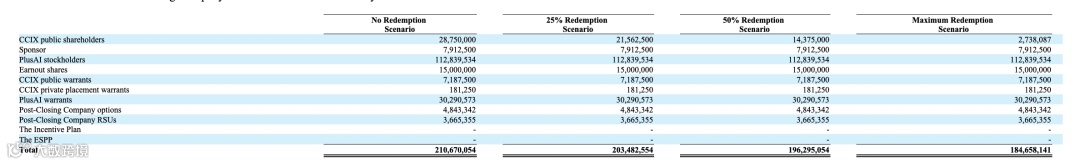 此外,潜在股权安排,包括 PlusAI 股东最多可获 1500 万股 “盈利分成股”,以及未行权期权、未解锁限制性股票及预留的员工激励 / 持股计划股份,这些虽暂不计入当前股权比例,但将长期影响股权结构。以 2025 年 6 月 30 日为基准,不同赎回情景下股权分布各有差异:无赎回情景下总股数 1.495 亿股,PlusAI 股东占 72.1%,最大赎回情景(涉及 2601 万股、2.726 亿美元)下总股数 1.235 亿股,PlusAI 股东占 89.9%,CCIX 公众股东占 2.6%。各情景下 PlusAI 股东均持主导权,既保障核心团队控制权,也为美国资本市场投资者预留空间,同时维持发起人股份稳定性以保障公司治理连贯。