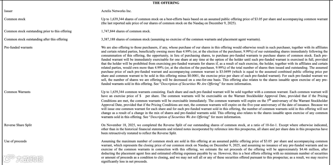 Actelis Networks, Inc. 正在推进一项以best-efforts方式进行的公开发行。本次发行拟最多出售 1,639,344 股普通股,假设发行价格为每股3.05美元,并配套发行普通股认股权证。在不考虑预付权证及认股权证行权的情况下,公司预计本次发行可获得 约446万美元的净募集资金,相关金额已扣除承销及发行费用。