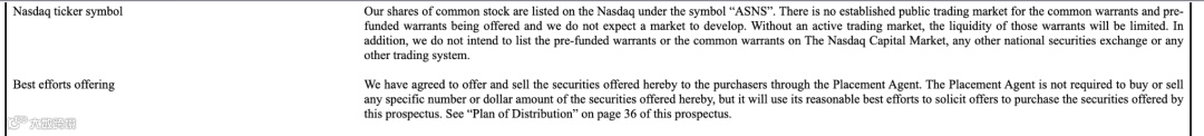 本次融资不设最低募集规模,最终实际到账资金将取决于市场认购情况。公司普通股已在纳斯达克资本市场上市,股票代码为 ASNS,本次发行完成后,公司普通股流通股本规模将进一步扩大,有助于提升股票流动性和资本市场关注度。