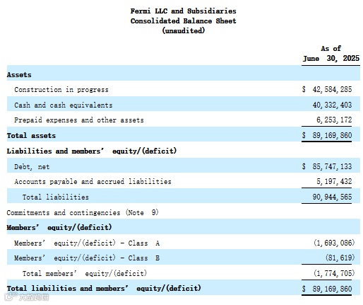 从财务表现来看,截至 2025 年 6 月 30 日,Fermi 仍处于业务筹备期,未产生任何营收,累计净亏损 636.76 万美元,其中 2025 年 Q6 净亏损 636.76 万美元(主要为项目前期投入),2025 年 Q1 净亏损 7.78 万美元(仅为基础运营成本),亏损规模随项目推进阶段性扩大。具体支出结构上,亏损主要集中两大板块:一是一般及管理费用 568.73 万美元,其中包含 360 万美元早期团队股份支付费用,属初创期人力成本;二是利息支出 68.03 万美元,来自前期可转换票据等融资工具,暂无生产性成本支出(项目未进入运营阶段)。资产状况方面,IPO 前公司历史净有形资产净值为 - 177.47 万美元(处于资不抵债状态),但随着 IPO 募资完成,财务结构实现根本性改善。