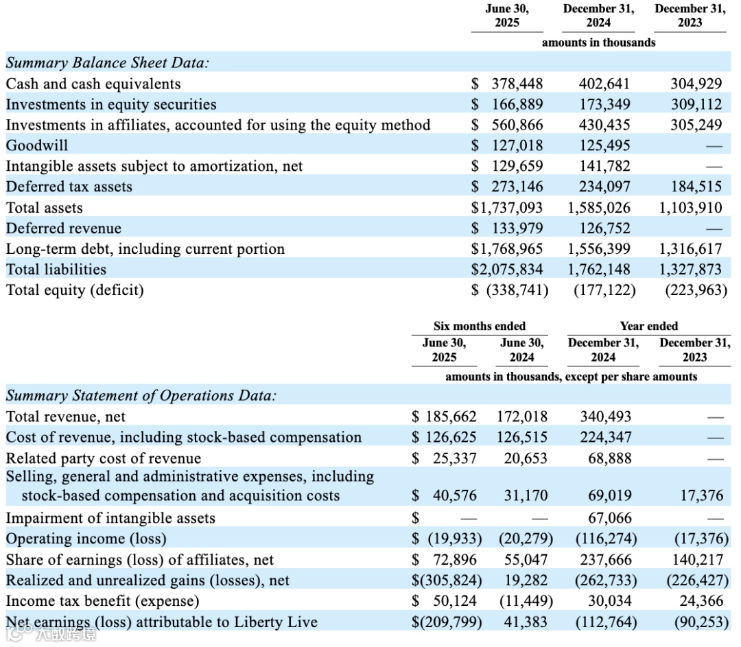 根据披露,Liberty Live 在拆分完成后将独立呈现其业务、资产与负债状况。截至 2025 年 6 月 30 日,公司总资产约 17.37 亿美元,其中现金及等价物 3.78 亿美元,联营公司投资 5.61 亿美元,商誉及无形资产合计超过 2.56 亿美元。同期总负债达 20.76 亿美元,主要由长期债务(约 17.69 亿美元)构成,股东权益为 -3.39 亿美元,显示出高杠杆与资本密集型特征。